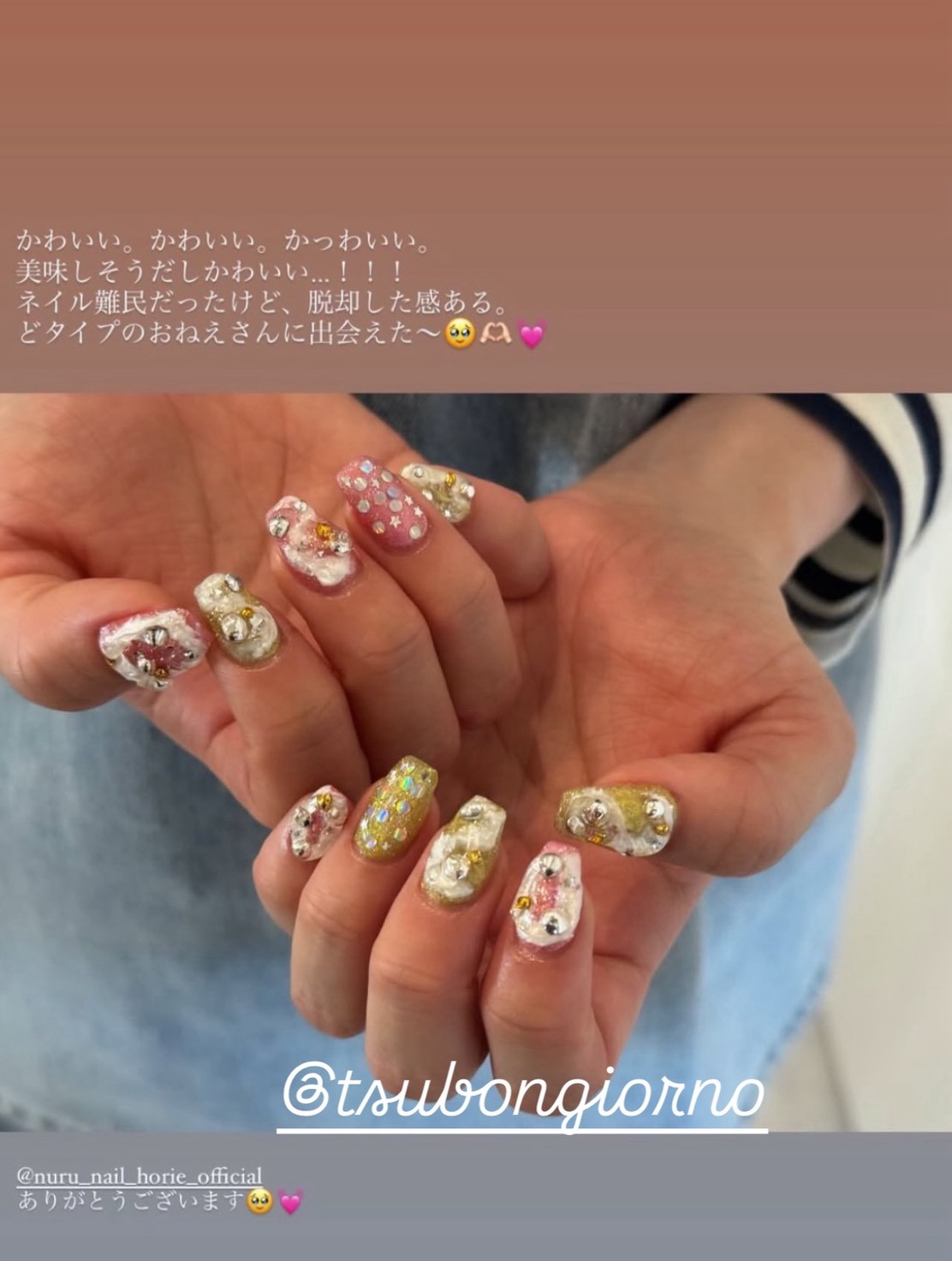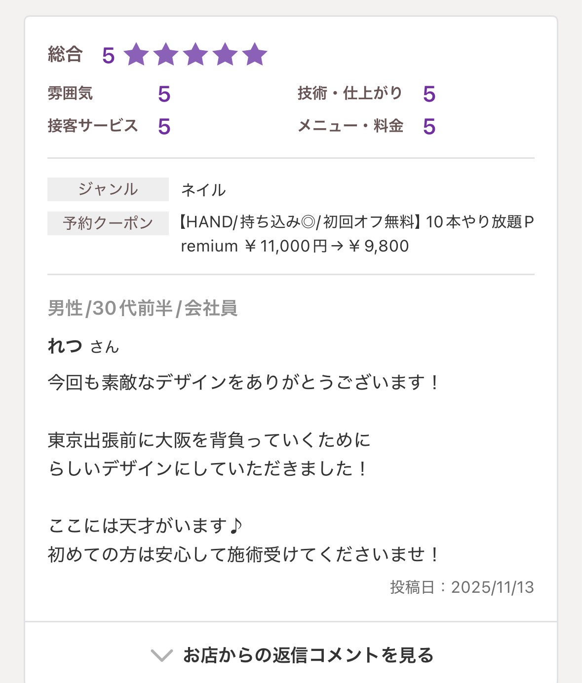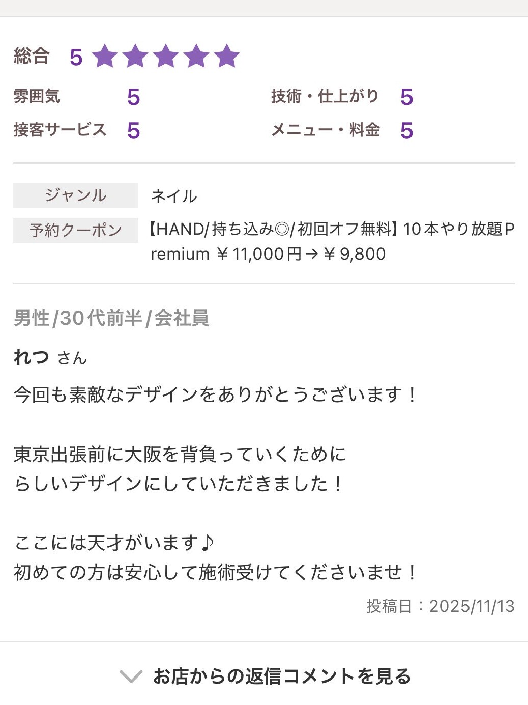 SALON光と空間 ― 時間で変わるNURUの表情 DAY:陽の光とともに10:00-17:00 大きな窓から差し込む自然光が、サロン全体を明るく包み込みます。休日のお昼、ゆったりとした時間の中で、指先から気分をリフレッシュ。 Night:夜の静けさのなかで17:00-21:00 日が暮れると、温かみのある間接照明がサロンを包みます。仕事帰りのひととき、落ち着いた空間で一日の疲れを癒しながら、美しい指先へ。 VOICEお客様の声 ご来店いただいたお客様から寄せられた、うれしいお言葉をご紹介します。私たちNURU NAIL堀江店の施術や空間が、どのように感じていただけているか。リアルな声をぜひご覧ください。 アクセスマップを見る
